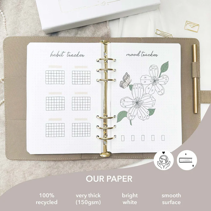 Kápan með opnanlegum klemmum gerir þér kleift að bæta við, fjarlægja og endurraða síðum eftir þínum þörfum. Þannig getur þú auðveldlega haldið utan um verkefni, markmið og hugmyndir á skipulagðan og persónulegan hátt.