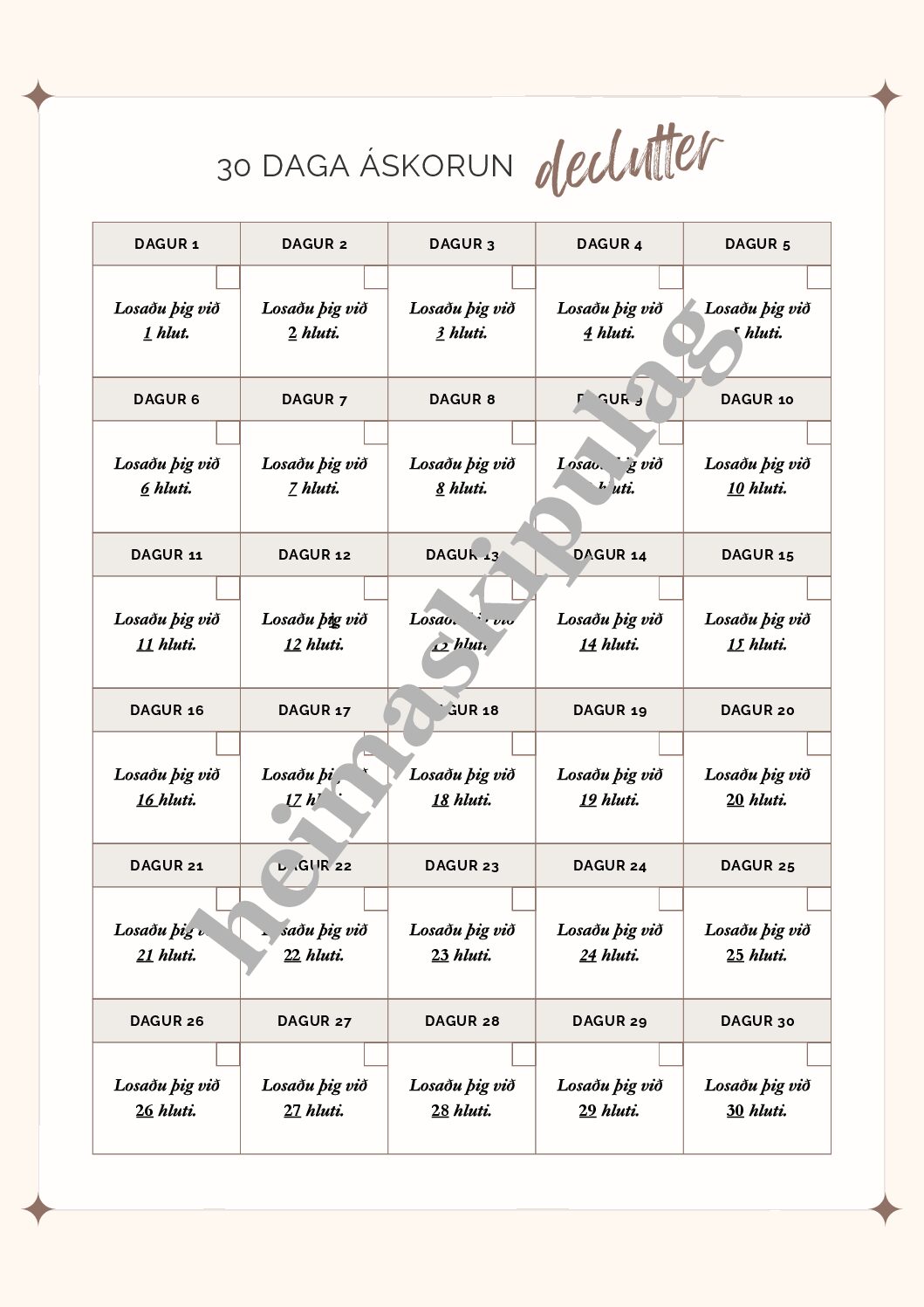 Ef þú losar þig við hluti alla daga eins og áskorunin sýnir, þá losnar þú við 465 hluti á 30 dögum – lítil dagleg skref sem skila ótrúlegum árangri ✨