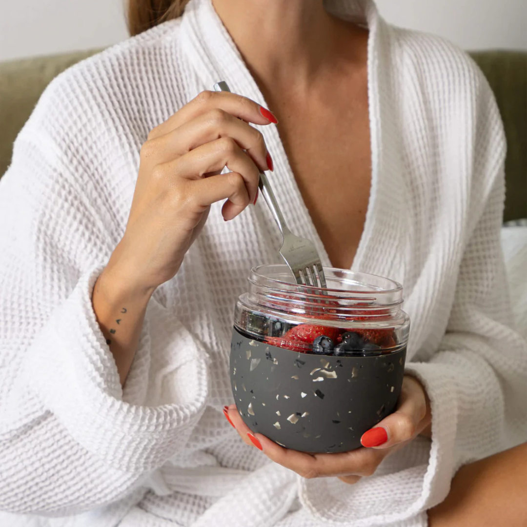 Frábærar krukkur fyrir grauta, jógúrt, súpur, pasta, salat, nesti og afganga. Utanum glerið er sílikon svo það sé auðveldara að halda á skálinni og veitir betra grip. Sílikonið utanum krukkuna hitnar ekki í örbylgjuofni og því auðvelt að taka krukkuna út þegar maturinn er orðin heitur. Krukkurnar eru 100% lekheldar.
