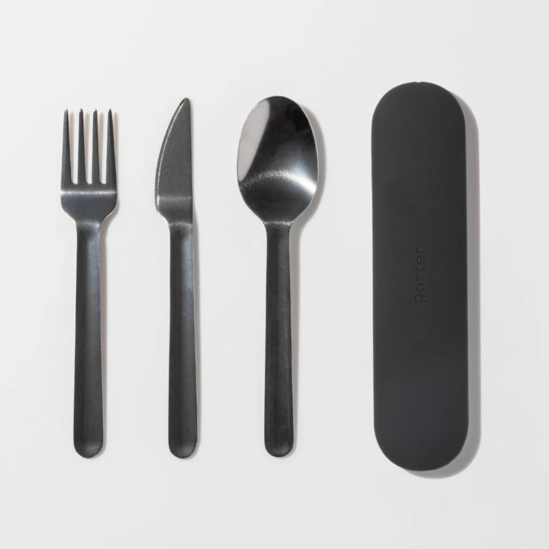 Porter hnífaparasett úr ryðfríu stáli sem er tilvalið til að taka með sér inn í daginn. Í sílikon hulstrinu er gafall, hnífur og skeið.