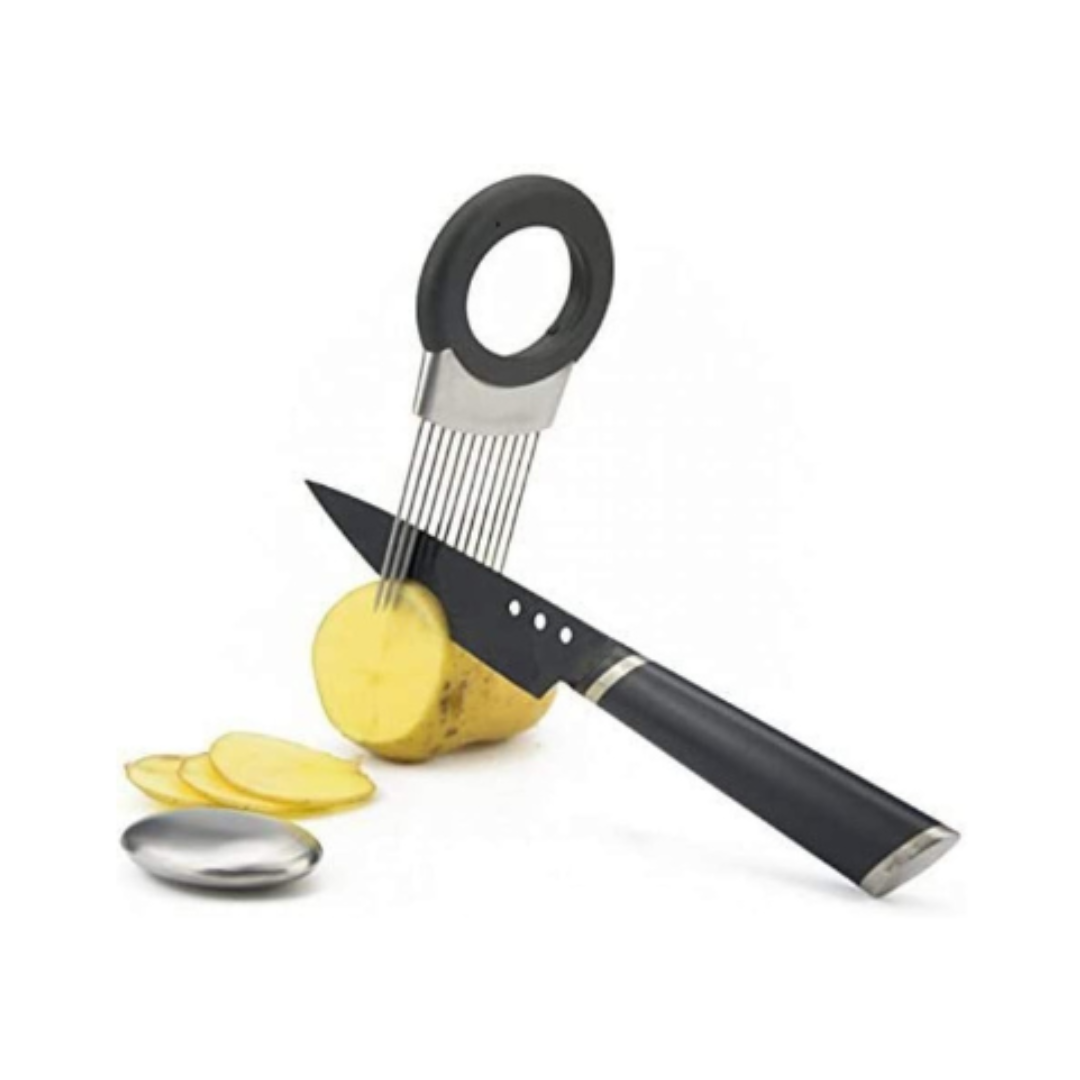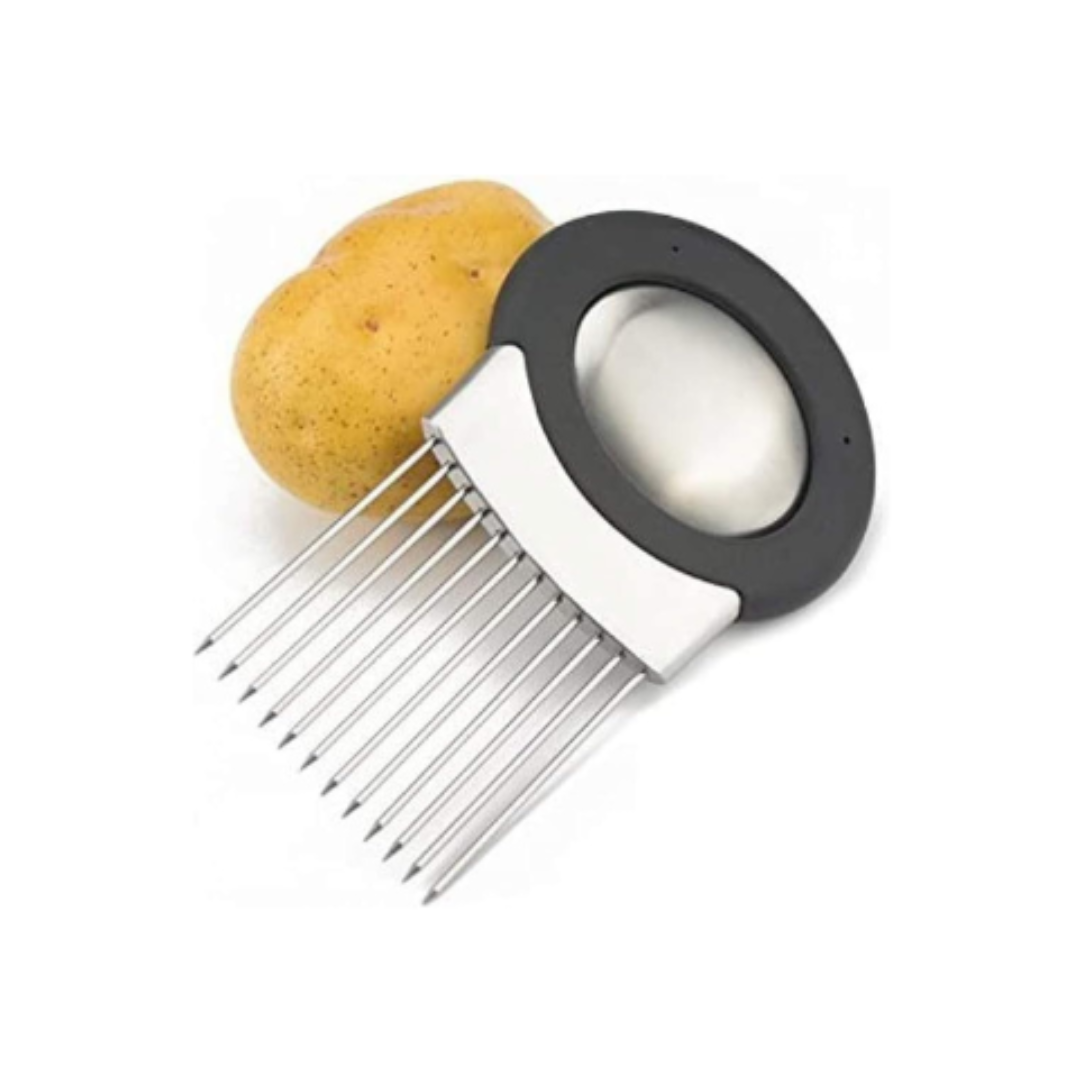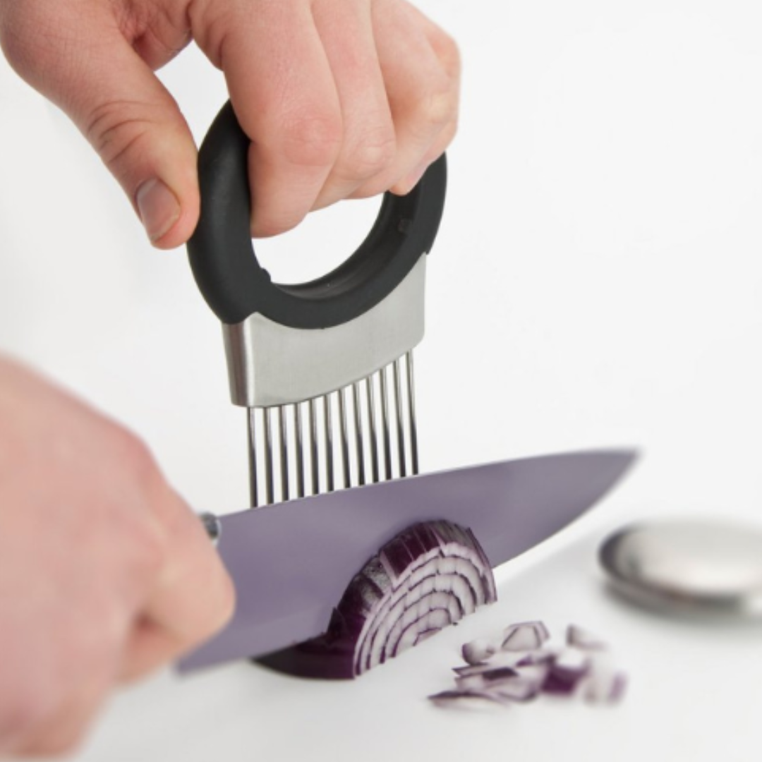 Lauk og grænmetis haldari með mjúku gripi. Sniðugt til að skera lauk, kartöflu og annað jafnt. Kemur með ryðfríu lyktareyðandi stál-stykki sem fjarlægir lauklykt af höndum.