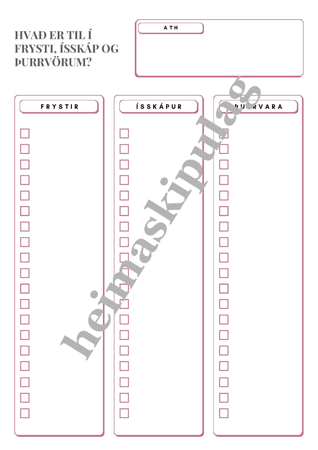 Þetta skjal er fyrir þá sem vilja taka matarinnkaupun í gegn. Einföld form sem hægt er að fylla inn í ásamt smá markmiðasetningu. Ef keypt er útprentað blað þá er listi á báðum hliðum, á framhlið er fyllt inn í eyðslu og á bakhlið er skrifað niður hvað er til í frysti, ísskáp og þurrvörum til þess að reyna að nýta allt sem til er.